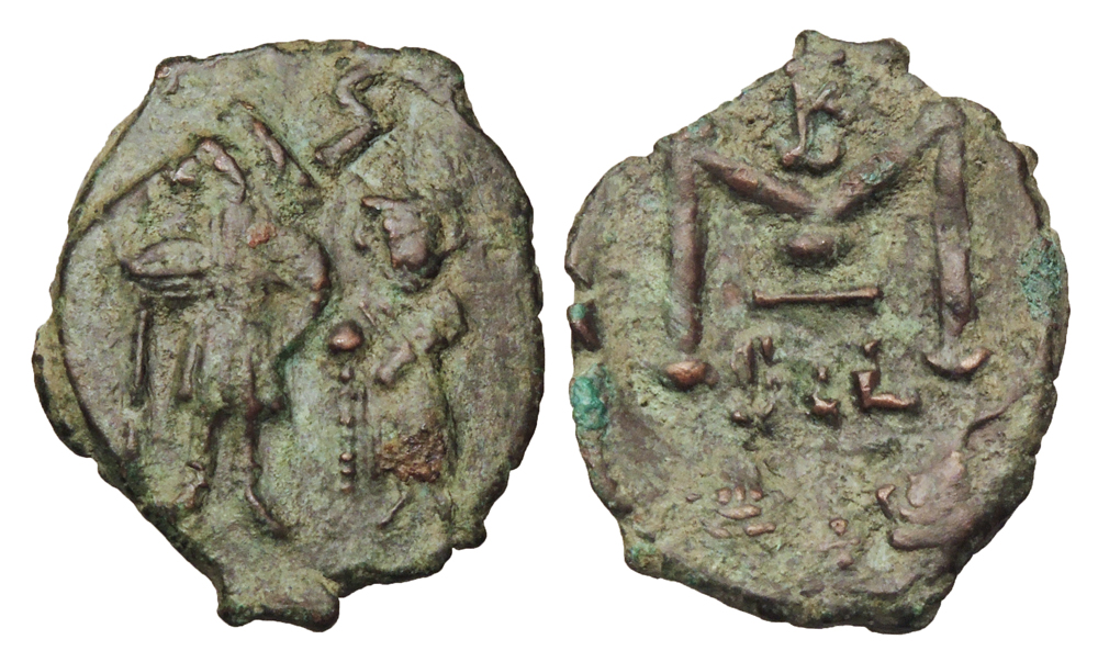 BYZANTINE EMPIRE. Constans II, 641-668 AD. AE Follis (3.76 gm) of Syracuse. Constans and Constantine IV standing facing / Large M over SCL. S.1109. VF+, green brown patina, overstruck.