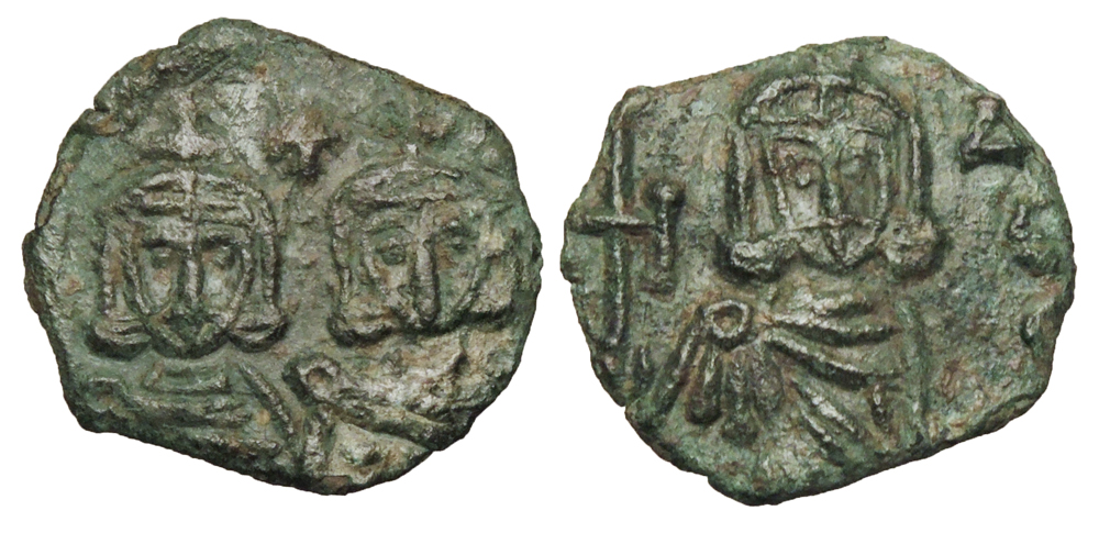 BYZANTINE EMPIRE. Constantine V and Leo IV, 741-775 AD. AE Follis (2.32 gm) of Syracuse. Crowned busts facing / Crowned bust facing of Leo III. S.1569. aXF, green patina. Scarce.