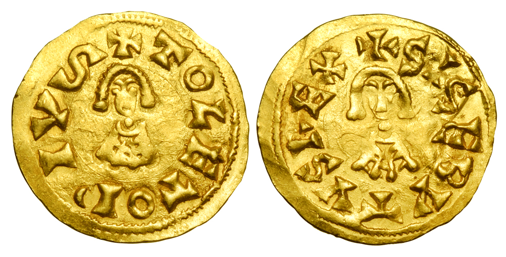 Lot 511. VISIGOTHIC KINGDOM. Sisebut, 612-621 AD. Gold Tremissis of Toledo. Scarce.