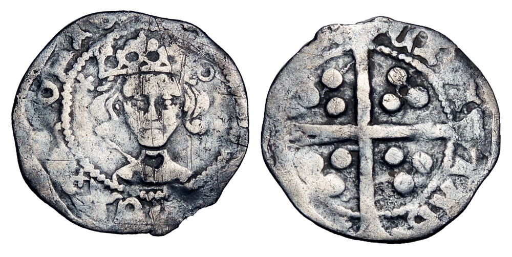 ENGLAND. Henry V, 1413-1422 AD. AR Penny (0.84 gm) of Durham. Crowned bust facing with mullet and broken annulet / Long cross with three pellets in each angle. S.1782. Toned Fine+