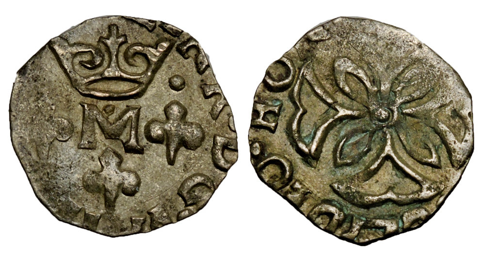 FRANCE, Orange. Fredrick Henry, 1625-1647 AD. Billon Liard (0.72 gm). Crowned M with three lis / Floral Maltese cross. Rob.5885. VF+
