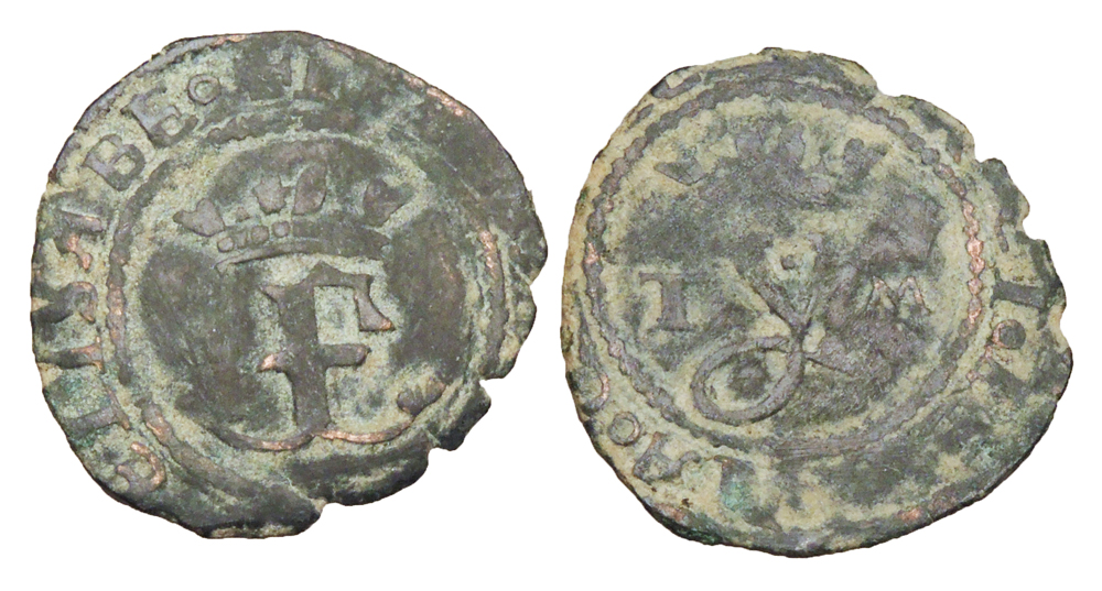 SPAIN. Ferdinand and Isabella, 1474-1504 AD. AE Blanca (1.30 gm) of Toledo. Crowned F / Crowned Y. CC.2426. Calico.679v. VF, dark green patina with earthen highlights.