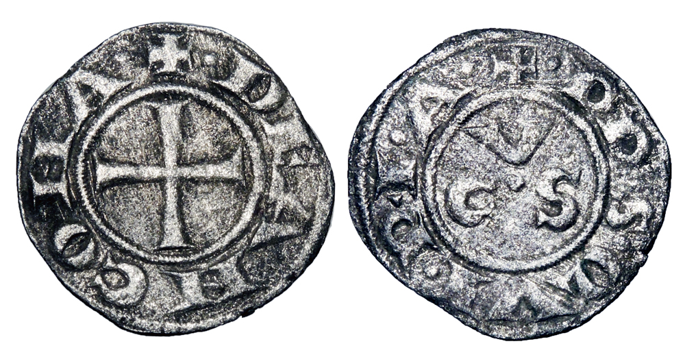ITALY, Ancona. XIII Century AD. Billon Denaro (0.60 gm). Cross / C V S. Bi.42. Toned aVF.