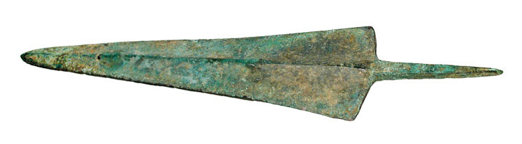 Bronze Sword Blade. Luristan, 1200-800 BC. Triangular shaped double edged blade with broad central ridge each side and short tang. 14" long overall. Moorey.38 Minor chipping, otherwise intact. Choice. ex. Arthur Sackler collection.