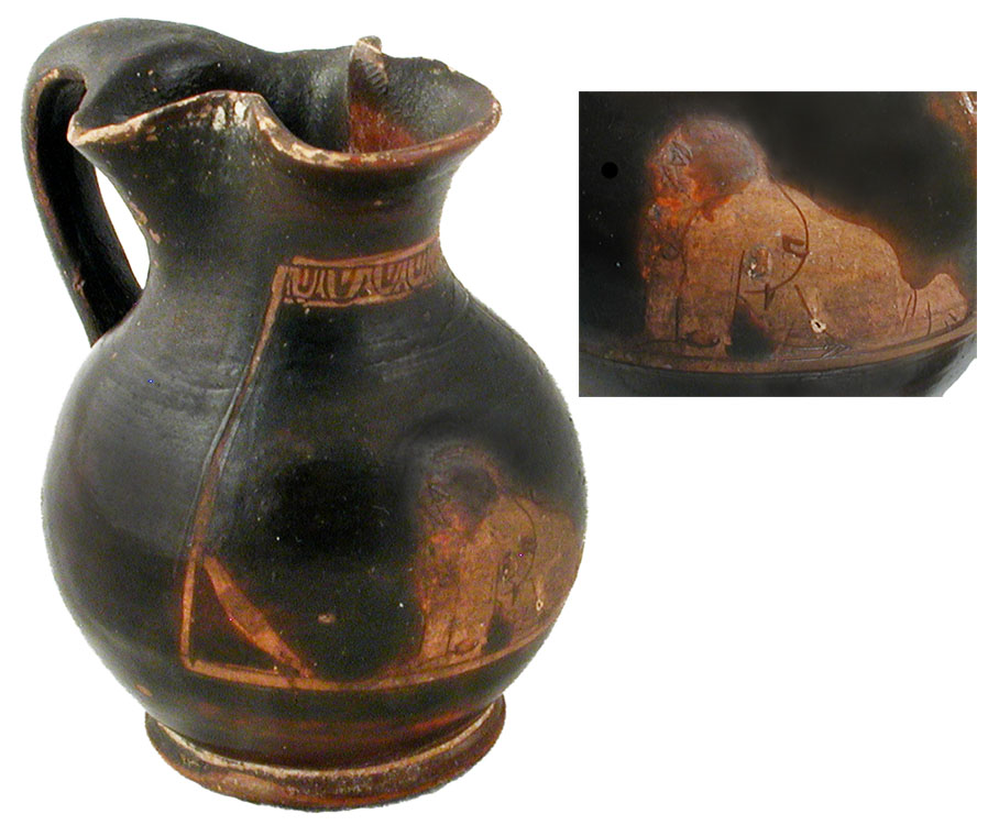 Memorial Red-Figure Choes. Attica, 440-420 BC. A miniature Oinochoai with trefoil mouth and squat body decorated with a naked young boy crawling. Commissioned by parents to be placed in the tomb of chidren who died before reaching the age of three and being able to celebrate "The Choes" spring festival of Dionysos. The chous was volume of 3.2 liters and a prize was given to the first to consume this much wine. Starting at the age of three, young boys could participate using miniature vessels. 2.5" tall. Some oxidation to paint. Intact and very rare.