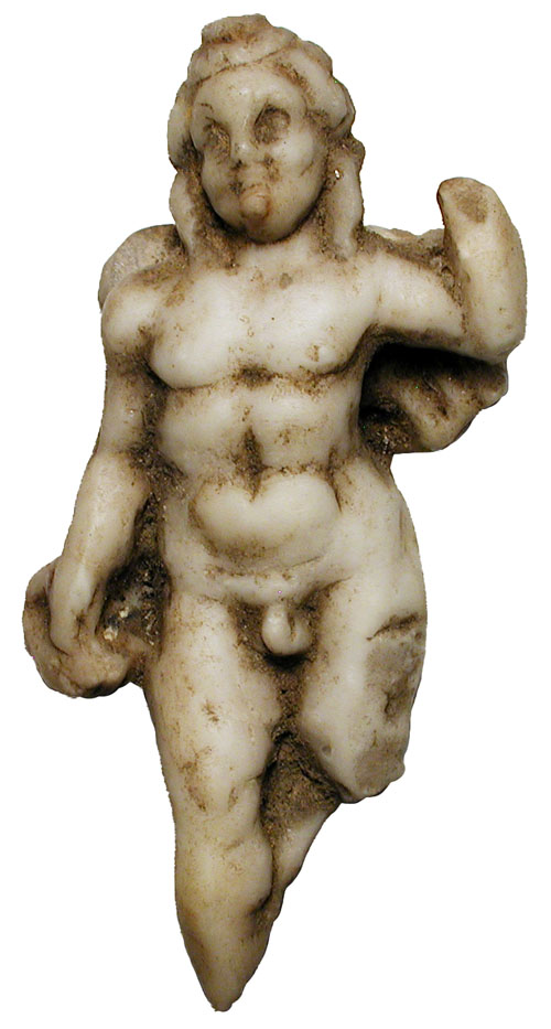 Marble Bas Relief Statue. Roman I-II Century AD. White marble bas-relief figure of naked winged man, presumably a Cherub from a cycle of life scene on a Sarcophagus. 4.5" tall. Missing one hand and lower legs; otherwise intact and choice. Well executed. A museum piece.