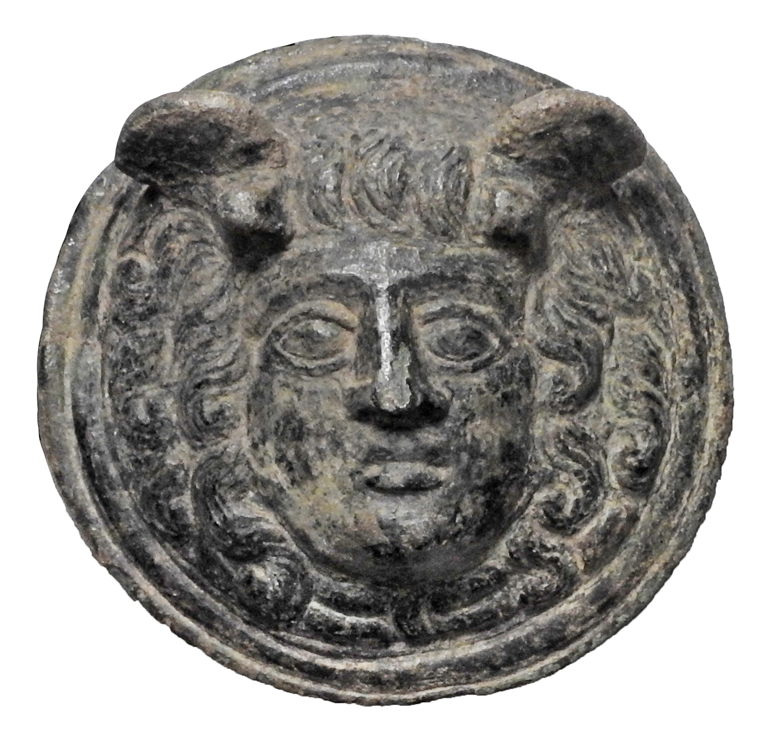 Bronze Applique Medusa Head. Roman, I-II Century AD. Heavy bronze circular applique with winged head of Medusa in high relief, iron mounting spikes to rear. Origanially decoration for a large chair, etc. 3.25" diameter, relief 1.5". Green patina. Outstanding. ex Gilman collection.