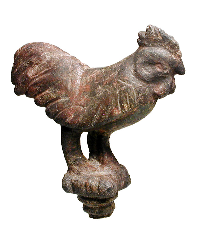 Bronze Rooster. Roman, II-III Century AD. Cast bronze firurine of rooster standing on capital, details engraved. 50 x 60 mm. On a lucite base (removable).