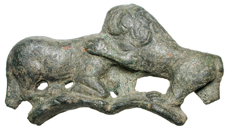 Bronze Figure of Lion attacking Bull. Roman, II-III Century AD. Heavy bronze furniture fitting, with design of lion pouncing on neck of bull. 2.5" long, broken from larger fitting. Figures missing hind foot, otherwise intact.