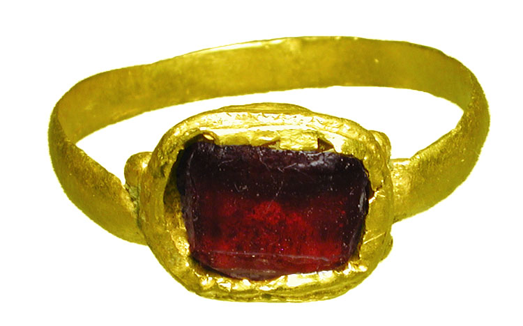 Gold Ring. Roman, II-IV Century AD. Gold ring with rectangular bezel set with red glass stone. Size 6.5. Intact and choice.