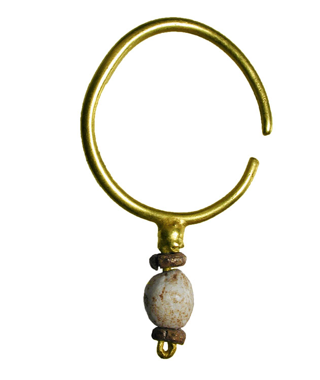 Gold Earring. Roman, II-III Century AD. Open loop with fixed pendant, holding a pearl and two small beads. 1.5" long. Intact and choice. Wearable.