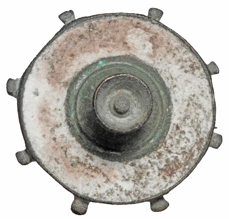 Enamelled Disc Brooch. Roman, II Century AD. Circular disc with eight lugs around and tall central boss, white enamel, original pin on back. Hat.1431. 40mm dia. Intact and choice