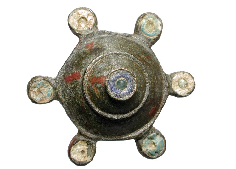 Enameled Wheel Brooch. Roman, II Century AD. Conical wheel brooch with blue enamel at the center and six lugs around with white enamel. 35mm overall. Hatt.1431v. Missing pin, else intact with most enamel remining.