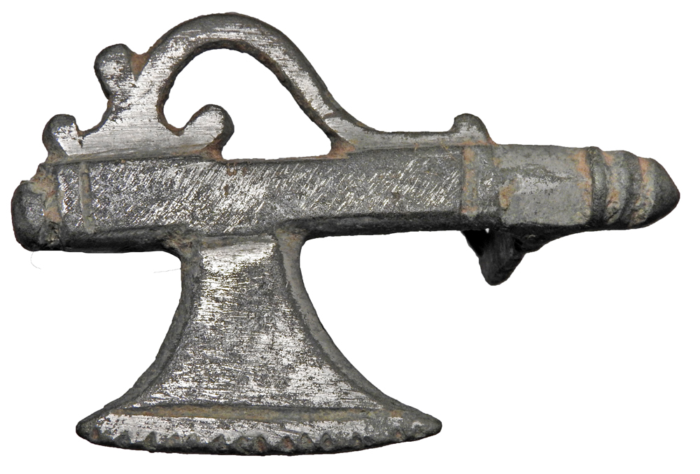 Tinned Bronze Axe-shaped Brooch. Roman, II Century AD. Skeuomorphic brooch with detailed figure of axe with side-loop. Hat.1143. 1.75" long; missing iron pin, but with nearly full tinning. Choice and Rare.