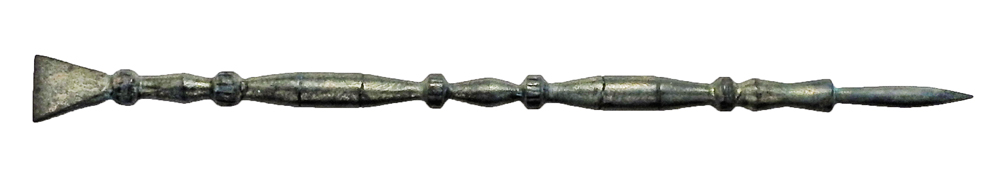 Bronze Writing Stylus. Roman, 100-300 AD. Bronze stylus (used for writing on wax tablets) with sharp writing point and wide chisel eraser, fine turned and inscribed decoration. Trace of tinning. 5.25" long. Superb condition a fortunate river find where the muck keep out the corrosive elements.