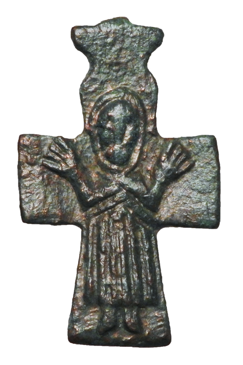 Bronze Cross. Byzantine, X-XII Century AD. Cross with moulded figure of the Virgin orans. 33mm high. Missing suspension-loop, otherwise intact.