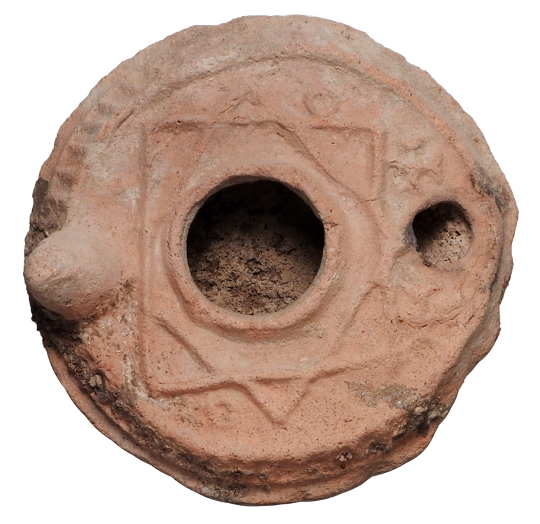 Christian Reference Oil Lamp. Palestine, VII-VIII Century AD. Round orange clay oil lamp with eight pointed star and crosses around filler hole and Greek Cross with split ends on base, palm on bottom beneath spout. 3.5" dia. Conical handle. A few chips but design is bold and fresh. Interesting Christian references.