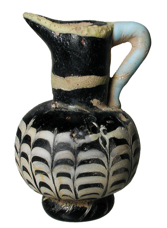 Glass Miniature Pitcher Islamic, 800-1200 AD. Miniature wound glass pitcher with dark blue body with feathered white decoration and yellow lip with a blue handle. 35 mm. Rare. Outstanding.