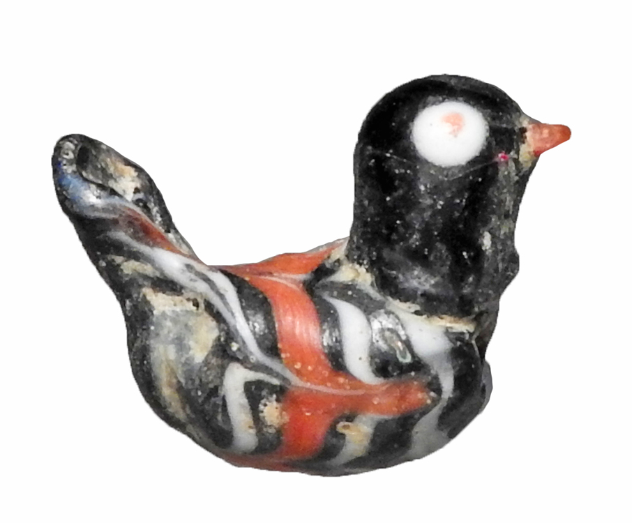 Glass Bird Amulet. Islamic, 700-1200 AD. Bird amulet bead in blue black wound glass with red and white chevrons on body, large white eyes with red pupil and red beak. Transverse hole for stringing. 20 mm. Intact and choice. Unusual colors.