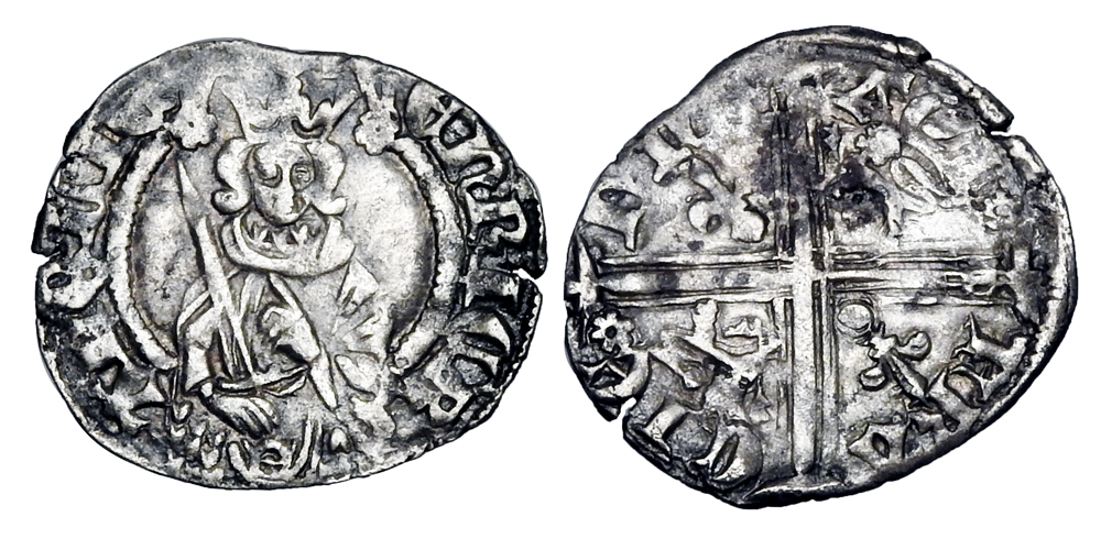 ANGLO-GALLIC, Aquitaine. Henry IV-VI, 1399-1453 AD. AR Hardi (0.98 gm). Half length crowned figure standing holding sword / Long cross with leopards and fleurs de lis. Elias.233. Toned VF.