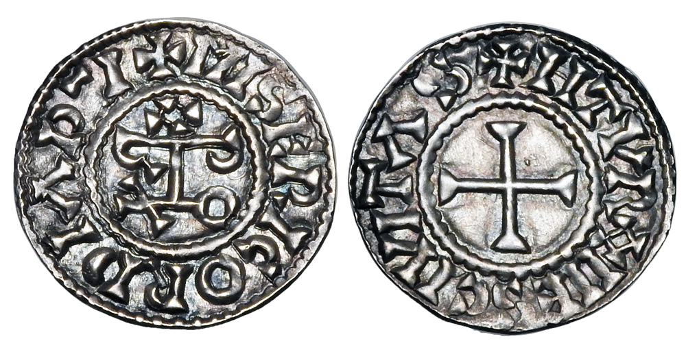 CAROLINGIANS. Odo, 888-897 AD. AR Denier (1.47 gm), Tours. ODO REX monogram / Cross. MEC.982. Toned Near Mint.