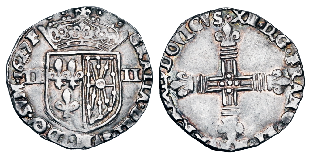 Lot 805. FRANCE. Louis XIII, 1610-1643 AD. AR Quart dÉcu de Navarre.