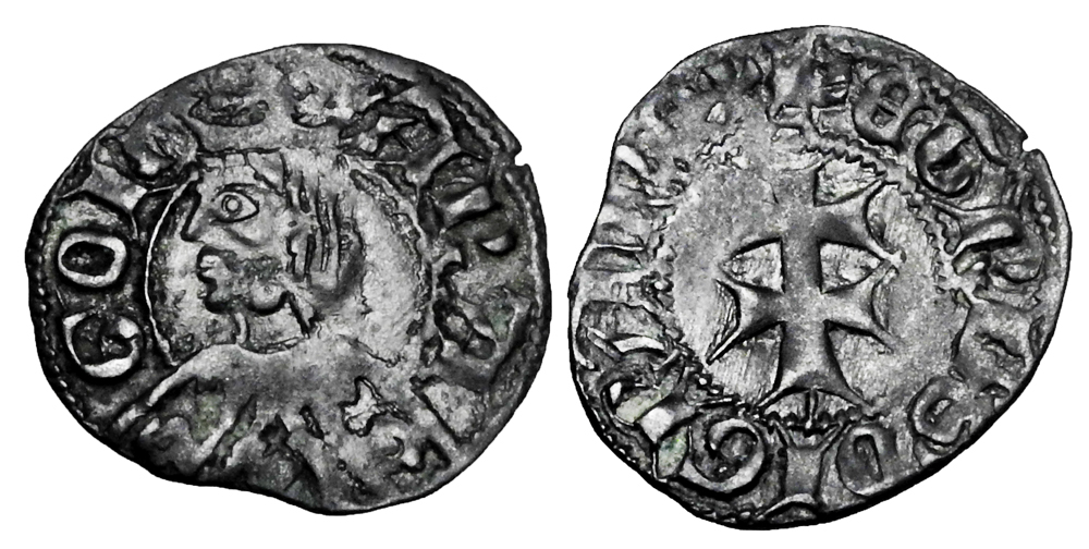 SPAIN. Kingdom of ARAGON. Pedro III de Aragon, 1336-1387 AD. Billon Dinero (1.10 gm) of Zaragoza. Crowned bust / Double barred cross Crus.463. Toned VF+. Scarce