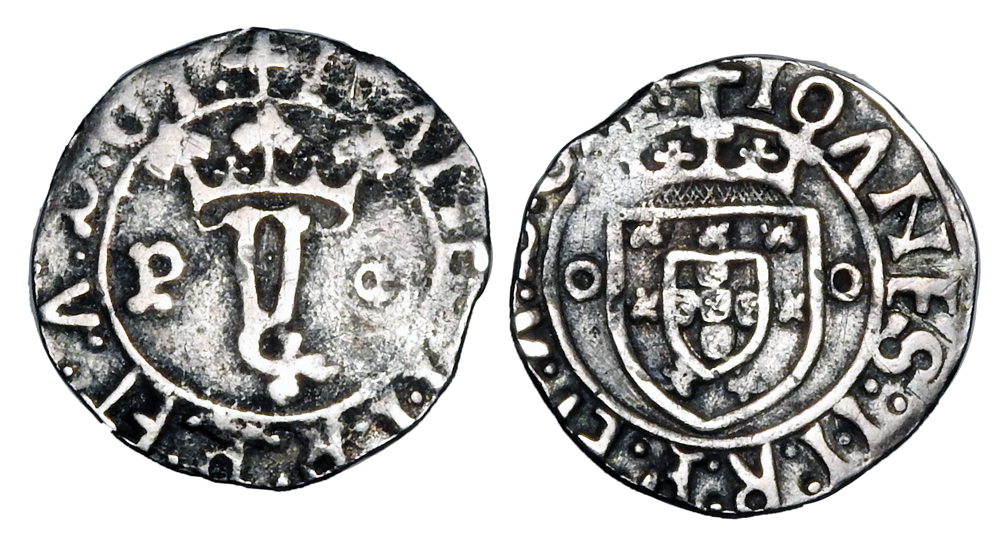 PORTUGAL. Joao II, the Perfect Prince, 1481-1495 AD. AR Vintem (1.84 gm) of Porto mint (P). Crowned Y / Crowned shield of arms. FV.J2.47. Toned VF.