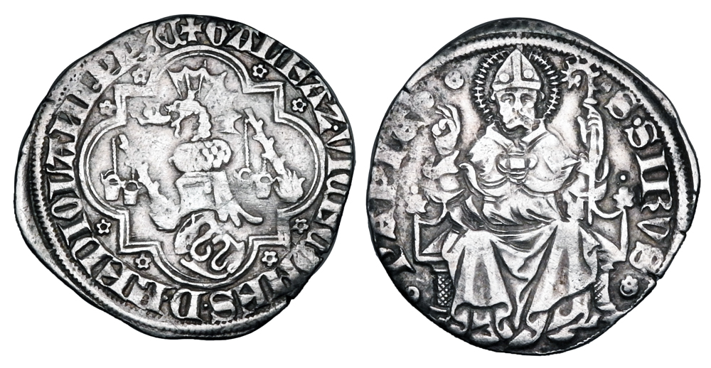ITALY, Pavia. Galeazzo II Visconti, 1359-1378 AD. AR Pegione (2.26 gm). Dragon crested helmet on shield of arms, buckets to sides / Saint Sirus enthroned facing. Biaggi.1844. MIR.845. VF