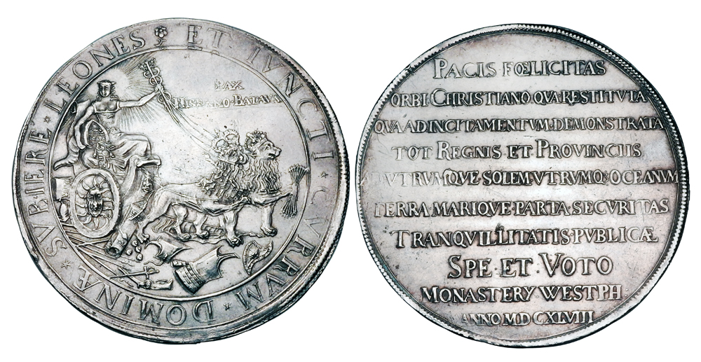 SPANISH NETHERLANDS. 1648 AD. AR Double Show Taler (43.01 gm), 1648. Pax in chariot drawn by two lions (Spanish and United Netherlands) over discarded arms / Inscription. Goppell.680. Beautifully Toned XF. Commemorates the Peace of Münster, ending the Thirty Years War in the Low Countries.