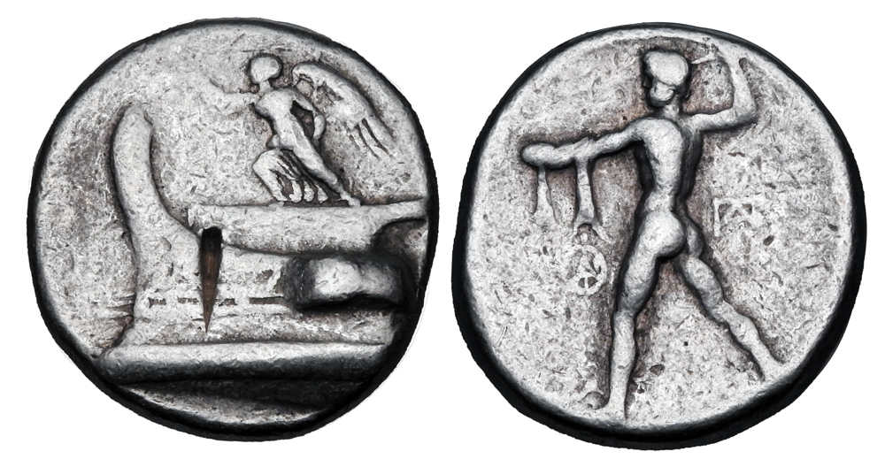 KINGDOM OF MACEDON. Demetrios Poliorketes, 306-283 BC. AR Tetradrachm (16.95 gm) of Pella. Winged Nike on prow / Poseidon standing brandishing trident. SNG.Cop.1178. aVF, test cut.