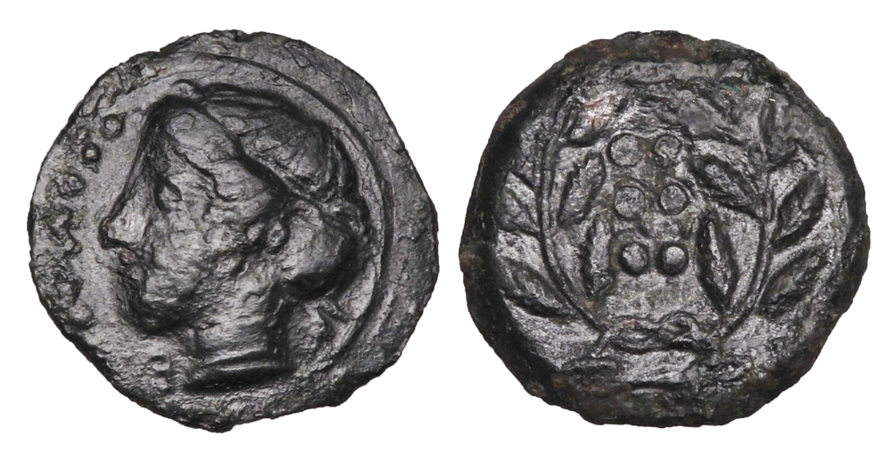 SICILY, Himera. 420-407 BC. AE Hemiltron (3.43 gm). Head of nymph / Six pellets within laurel wreath. CNS.35. SNG.ANS.186. VF+, brown black patina.