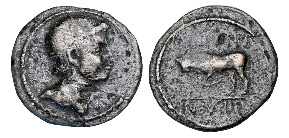 CELTIC GAUL. 10 BC. Brass 18 (3.21 gm) of Germanus Indutilli L., copying Lugdunum quadrans of Augustus RIC.450. Head right / Bull standing left. RPC.506. aVF, brown patina.
